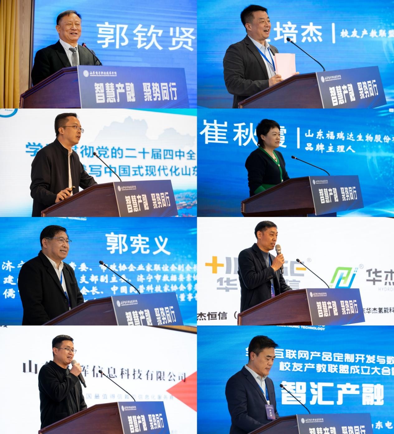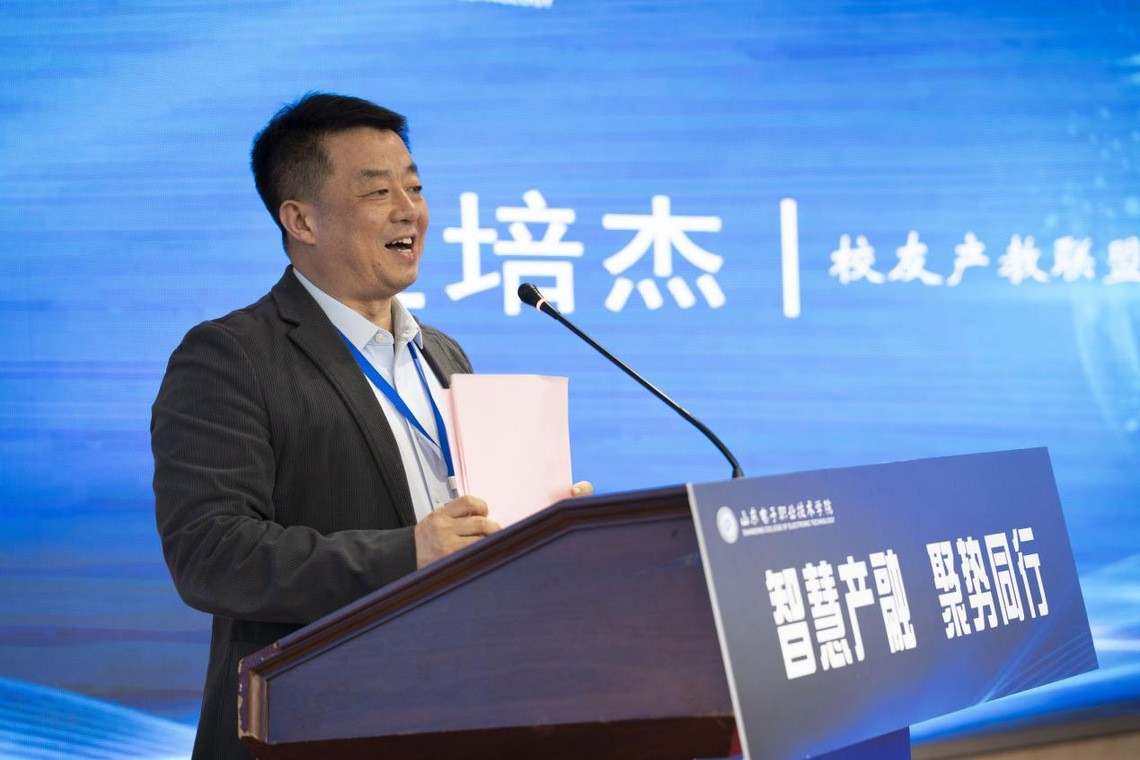 王培杰代表山电校友产教联盟首届理事会发言,表示联盟将秉持“共生、共享、共赢”原则,团结全体成员,重点推进人才培养共同体、技术创新协作体和校友发展服务体建设,赋能产业升级,凝聚校友力量。
