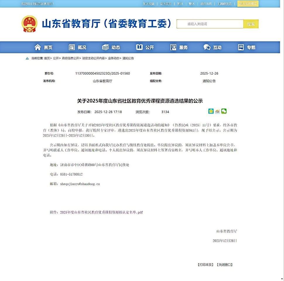 12月26日,山东省教育厅公布了2025年度山东省社区教育优秀课程资源拟认定名单,枣庄职业学院18门优质社区课程成功入选。此次入选数量不仅较2024年实现100%翻倍增长,更较近三年平均入选数量大幅提升170%,创下学校历年省级社区教育优秀课程资源入选数量新高,标志着学校社区教育课程建设实现跨越式发展。