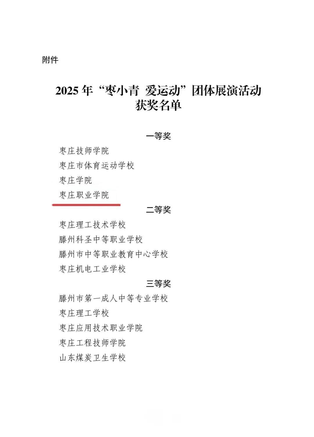 枣庄职业学院荣获“枣小青 爱运动”全市团体展演活动一等奖
