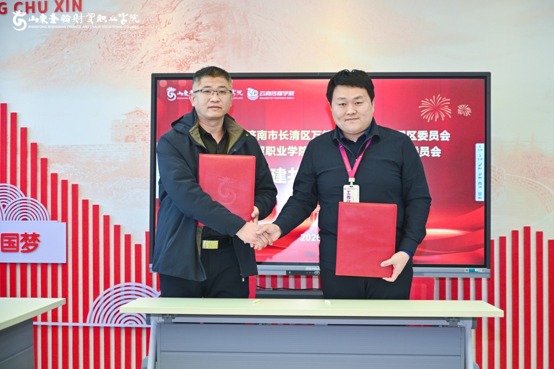 签约仪式上,双方代表共同签署党建共建合作协议,标志着山东圣翰财贸职业学院云商传媒学院党总支与济南市长清区万德街道8号路管理区党委的合作迈入规范化、长效化发展新阶段。
