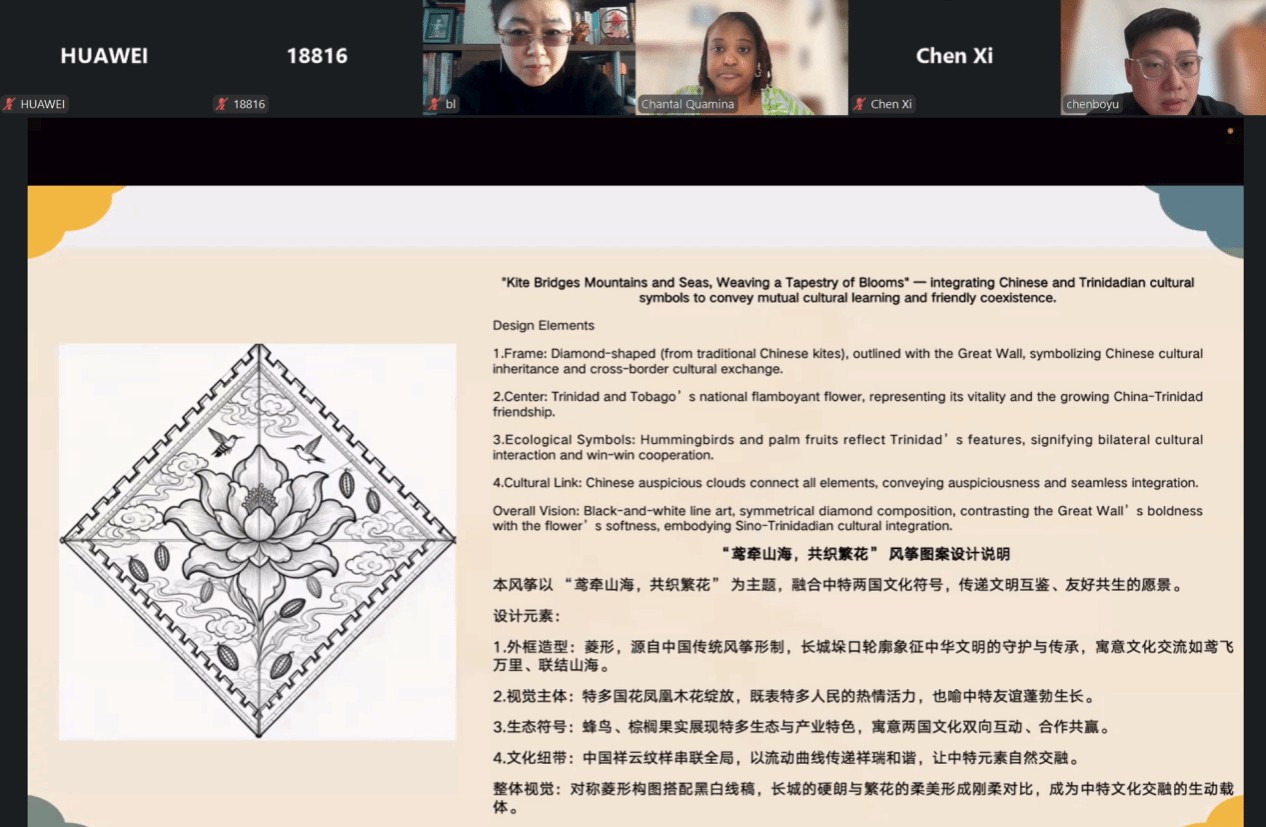 在交流研讨环节,双方艺术家就设计理念、文化象征、工艺实现、数字化运营推广等方面展开研讨交流。中方艺术家分享了以中国京剧、敦煌飞天、青花瓷、神话人物等为主题的设计,特多艺术家则将中国的传统文化元素融入艺术创作中,并分享了风筝文创在特多本地的传播和数字化推广方式,多款文创设计均体现了两国文化“各美其美、美美与共”的融合理念。例如,一款以“鸢牵山海,共织繁花”为主题的风筝设计,以菱形为外框,融入长城垛口与特多国花凤凰木,搭配蜂鸟、棕榈果实与祥云纹样,在特多本地的文创市场上有着极大的吸引力,也充分寄托了两国文明互鉴、合作共赢的美好愿景。