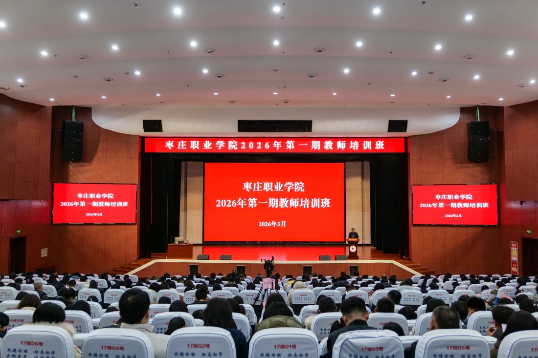 3月1日,枣庄职业学院在大礼堂举办2026年第一期教师培训班。学院领导梁家和、张华伟、王念、刘希震、张蓝兮、闫博、郝艺、曹先贺出席开班仪式,全体教职工参加培训。