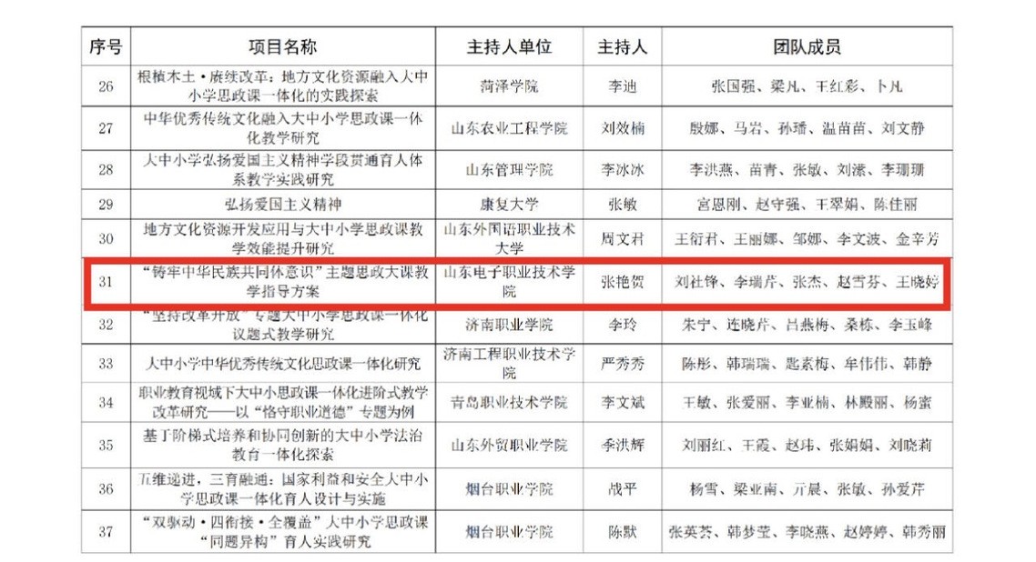 近日,山东省教育厅公布了《2025年山东省思想政治教育教学改革项目立项名单》,山东电子职业技术学院思政部张艳贺老师主持申报的《“铸牢中华民族共同体意识”主题思政大课教学指导方案》项目,成功获批“大中小学思政课一体化教学研究项目”。