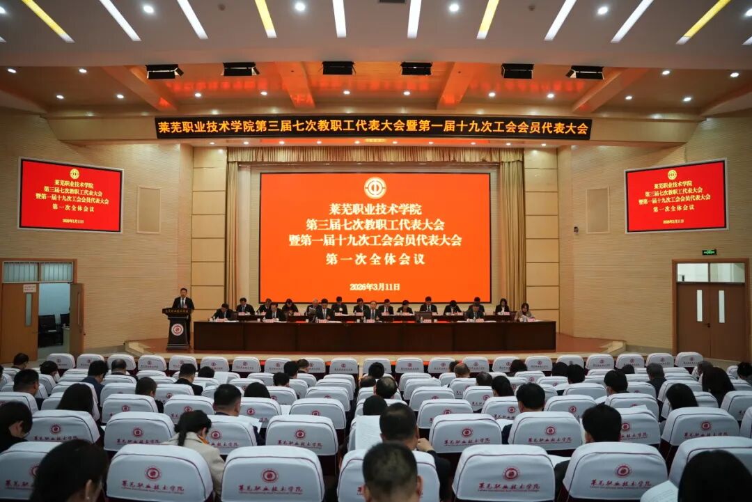 3月11日下午,莱芜职业技术学院第三届七次教职工代表大会暨第一届十九次工会会员代表大会在图信报告厅召开。校领导徐运国、杨洪涛、李允实、贾友军、周美栋、张静、任清华出席会议。教职工代表、工会会员代表齐聚一堂,共商学校发展大计,共谋改革创新良策。会议由党委副书记李允实主持。