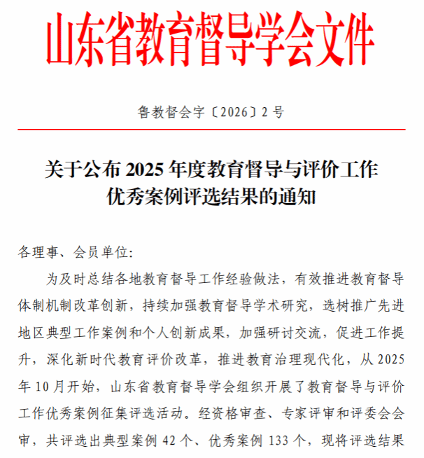 本次评选活动由山东省教育督导学会组织,自2025年10月启动以来,面向全省征集教育督导与评价工作优秀案例,共收到申报案例308个。经资格审查、专家评审和评委会会审,最终评选出典型案例42个(其中高职院校11个)、优秀案例133个(其中高职院校24个)。学校在此次评选中取得佳绩,共有两项案例成功入选优秀案例。分别为,由质量监控与绩效考核中心牵头、联合网络信息中心与组织人事处申报的“数字化转型背景下的高职院校教师评价改革与实践”,由信息工程学院申报的“工学融合·标准穿透·评价重构:信息类专业‘三维三阶’质量治理新体系构建”。