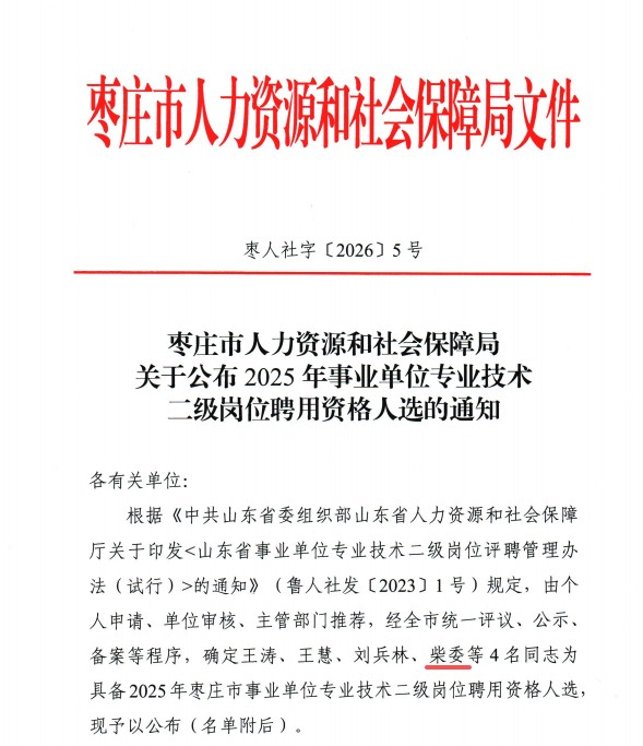 近日,枣庄职业学院柴委教授获聘2025年枣庄市事业单位专业技术二级岗位,成为建校以来首位二级教授,标志着学校在高层次人才队伍建设方面实现了历史性跨越。