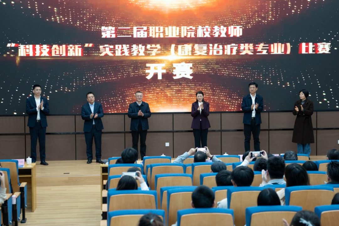 开幕式上,中国职业技术教育学会医药卫生教育专业委员会执行主任、江苏医药职业学院党委书记陈国忠在致辞中阐述了职业教育的重要地位与使命担当,强调了康复治疗类专业人才培养对保障全民健康、助力健康中国建设的重要意义。他表示,本次大赛立足教育强国建设的时代背景,聚焦康复治疗类专业教师能力提升,通过“以赛促教、以赛促改、以赛促建”,推动人才培养由知识传授向综合能力提升转变,希望各参赛院校以大赛为契机深化教育教学改革,凝聚行业合力,共同推动医药卫生职业教育高质量发展。