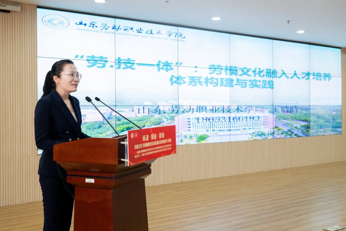 王晴晴在发言中指出,山东劳动职业技术学院自1955年建校以来,把劳动文化融入教育教学、办学治校、人才培养全过程,将“劳动文化”定为学院的特色文化,形成以“劳动精神、工匠精神、劳模精神”为核心的“四位一体”劳动文化育人体系。学院深化提出“育匠魂、养匠品、铸匠技“三匠”劳动文化”,确立“劳·技一体、融技铸劳”劳动教育育人理念,以培养学生“爱劳动、精技能、善创造”为目标,以劳动精神育匠品,以工匠精神培匠技,以劳模精神铸匠魂,推动今日小学徒成长为会劳动、强技能、有情怀的明日大工匠。