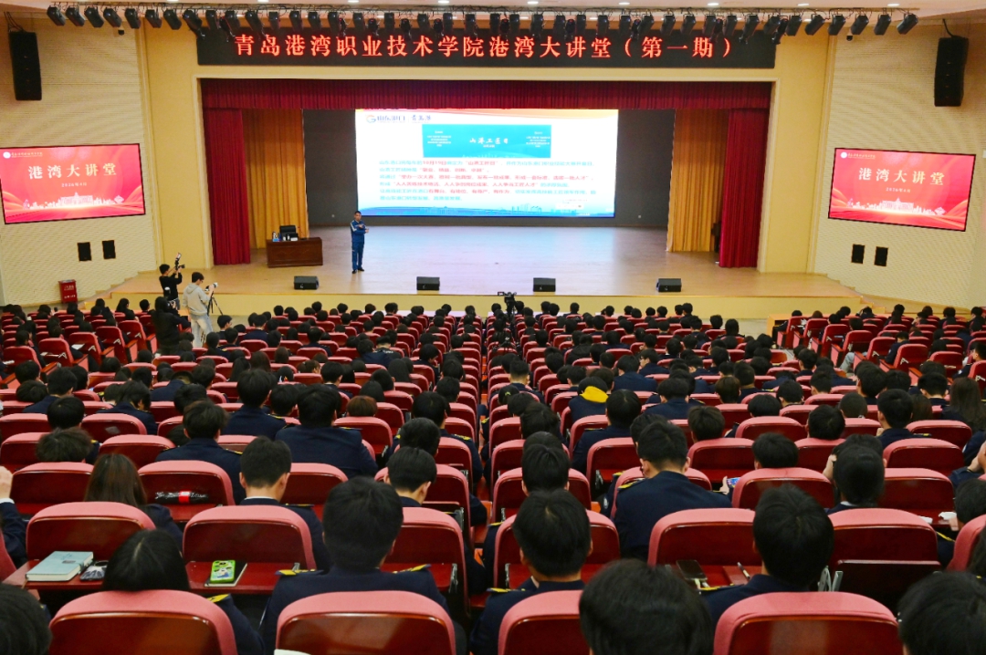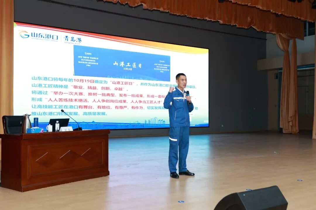 世界读书日来临之际,在山东港口青岛港工会的大力支持下,青岛港湾职业技术学院学术报告厅内灯火如昼,座无虚席。一场以“赓续红色血脉,传承工匠精神”为主题的“港湾大讲堂”首期报告会,在这里温情启幕。主讲人郭磊——山东港口青岛港首席技师、高级工程师,“人民工匠”许振超的亲传弟子,带着他三十余载的港口故事,走上讲台。台下几百双年轻的眼睛,在灯光里闪烁期待。