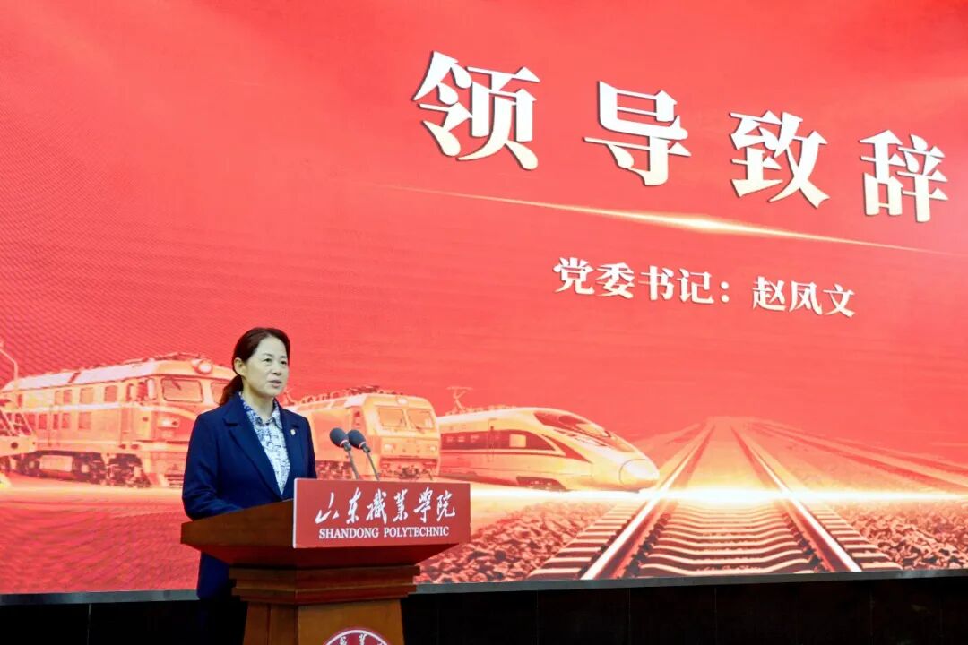 赵凤文在致辞中指出,山东职业学院与铁路有着血脉相连、无法割舍的深情。我们因铁路而生,伴铁路而长,铁路就是我们的根,就是我们的魂!举办系列活动旨在深度挖掘、传承铁路文化,弘扬、致敬工匠精神。她寄语同学们从铁路百年史中汲取信仰的磅礴力量,从工匠故事中感悟坚守的价值,从安全案例中筑牢生命的底线,从职场分享中看清奋斗的星辰大海!把青春的轨道,牢牢铺在祖国最需要的地方!