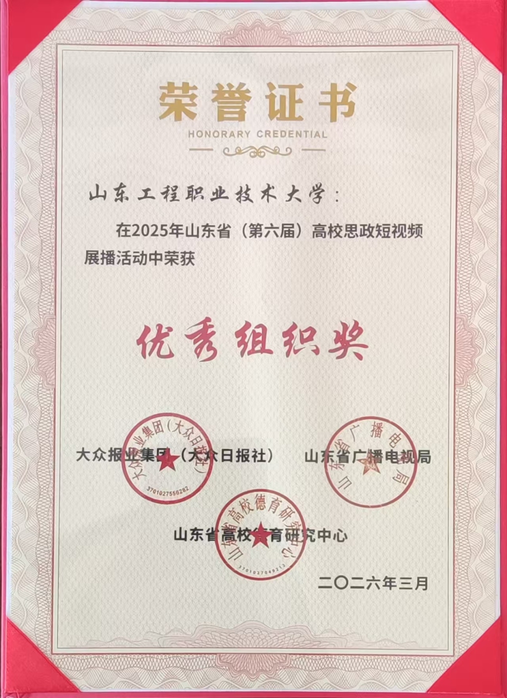 近日,2025年山东省(第六届)高校思政短视频展播活动获奖结果公布。山东工程职业技术大学凭借精心的组织策划与鲜明的职教特色,从众多参赛高校中脱颖而出,荣获“优秀组织奖”,这一荣誉不仅是上级部门对山东工程职业技术大学思政工作创新能力的肯定,更是深耕网络思政教育、构建“大思政课”育人格局的生动缩影。