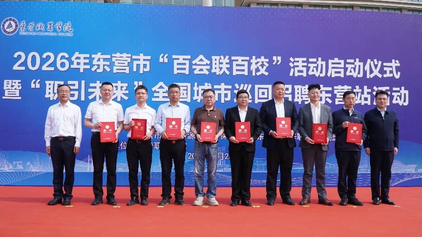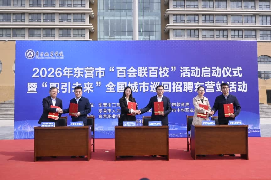 4月26日,2026年东营市“百会联百校”活动启动仪式暨“职引未来”全国城市巡回招聘东营站活动在东营职业学院举行。此次活动由市工商联、市教育局、市人力资源和社会保障局、市中华职教社联合主办,东营职业学院承办。