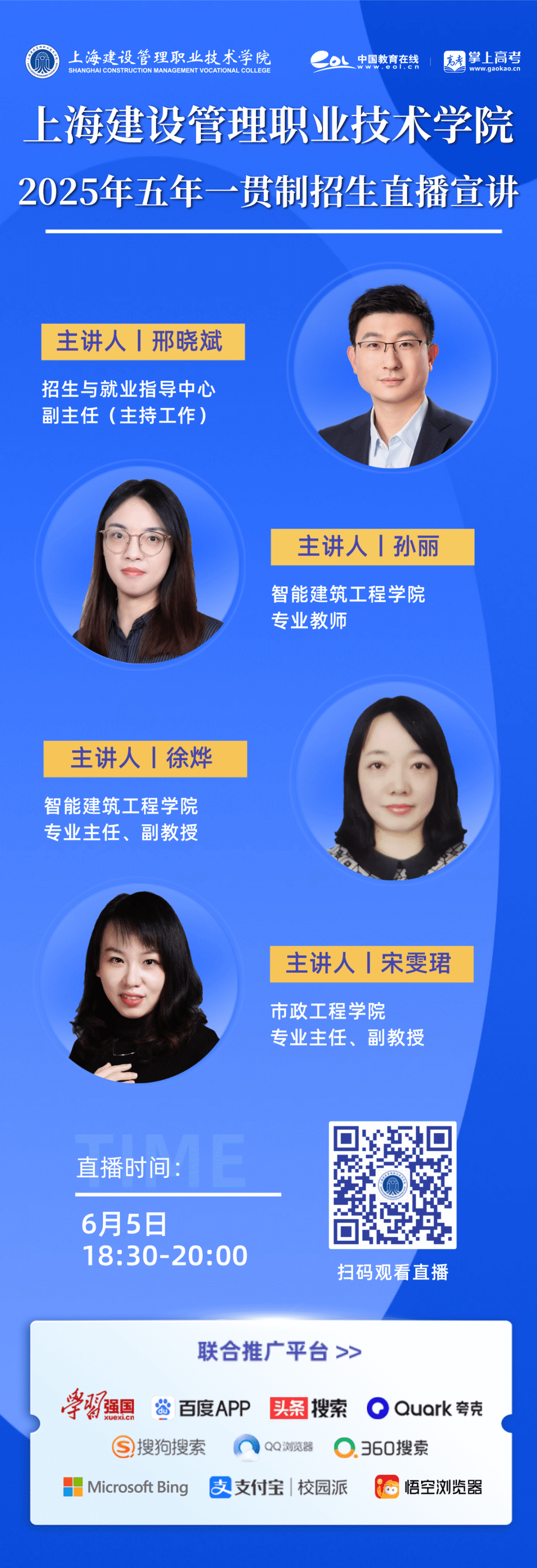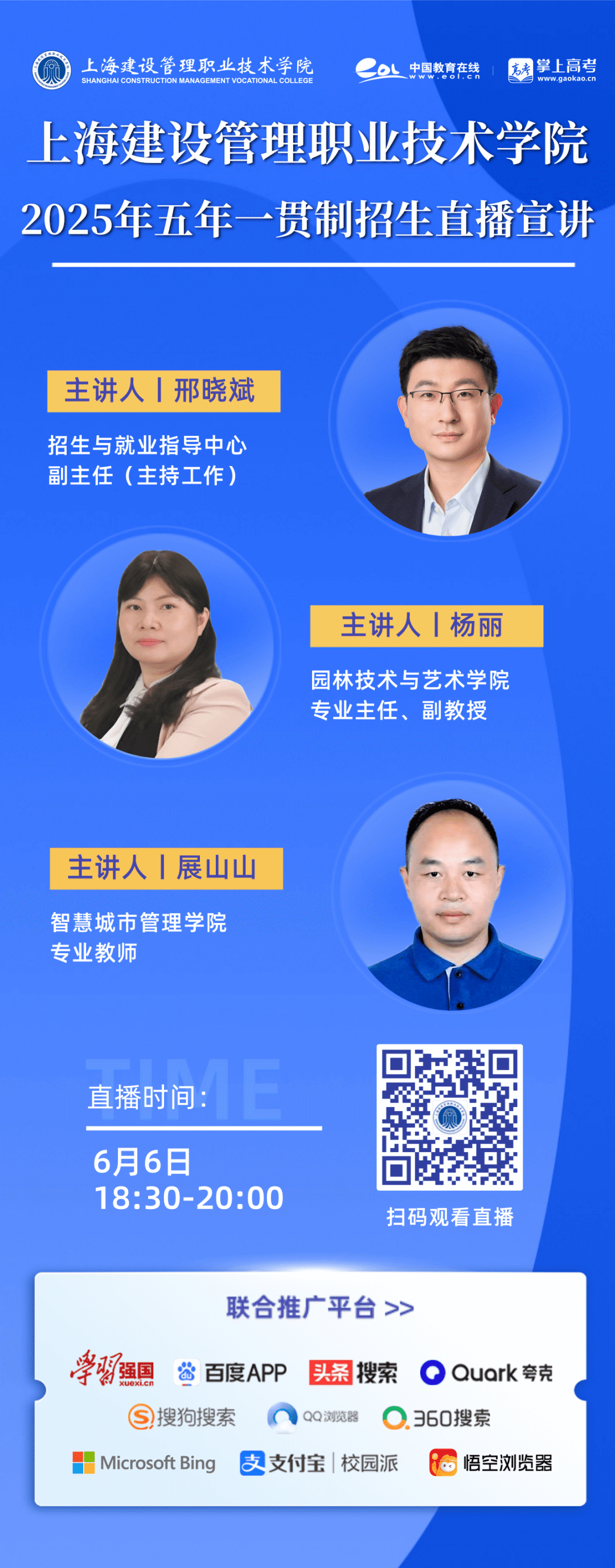 为满足广大考生和家长的咨询需求,6月5日、6日18:30,上海建设管理职业技术学院2025年五年一贯制招生直播宣讲即将启动!我们为你准备了专业的讲解阵容、优质的咨询服务、大量的报考资讯,欢迎你扫码观看,实现面对面答疑,我们在直播间等你!