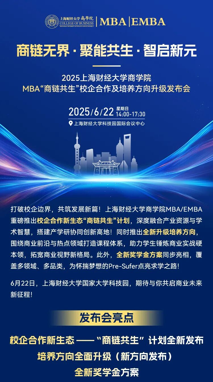 6·22重磅预告丨商链无界·聚能共生·智启新元2025上海财经大学商学院MBA“商链共生”校企合作及培养方向升级发布会