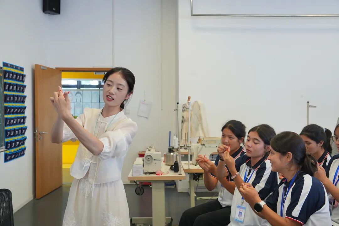另一组参与“AI+非遗盘扣设计制作”体验活动,现场细致拆解了盘扣制作从面料上浆到最终装裱的13道繁复工序,同时引导同学们借助AI技术,对传统盘扣的图案纹样、结构形态展开数字化分析。在挖掘其背后美学规律与文化内涵的基础上,尝试设计出既保留传统韵味、又契合现代审美的盘扣新样式。在科技赋能与非遗传承的碰撞融合中,进一步加深了对中华优秀传统文化的理解与认同。