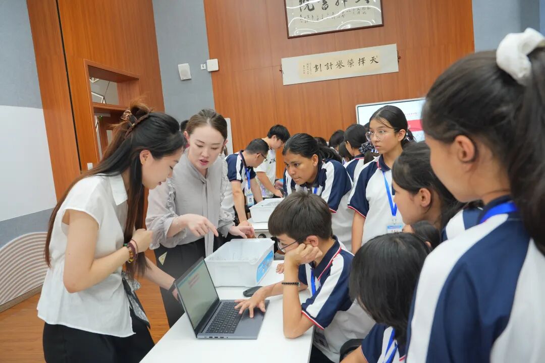 会后,75名泽普学生分为两组同步开展体验活动。其中一组参与“AI+教育机器人编程与调试”体验项目,项目依托我院与上海鲸鱼机器人科技有限公司共建的校企课程,聚焦“AI技术+创新实践”交叉领域核心,帮助同学们系统了解机器人架构、PID算法及多传感器开发知识,通过实操训练逐步掌握相关技术能力,同学们在动手实践中深度融合工程思维与算法创新,进一步塑造学生科技报国的使命担当与精益求精的工匠精神。