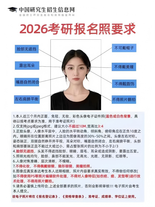 3.请考生按照2026年考研报名要求提供本人电子证件照,如考生未能提供符合要求的照片,由此引起的后果由考生自行承担。