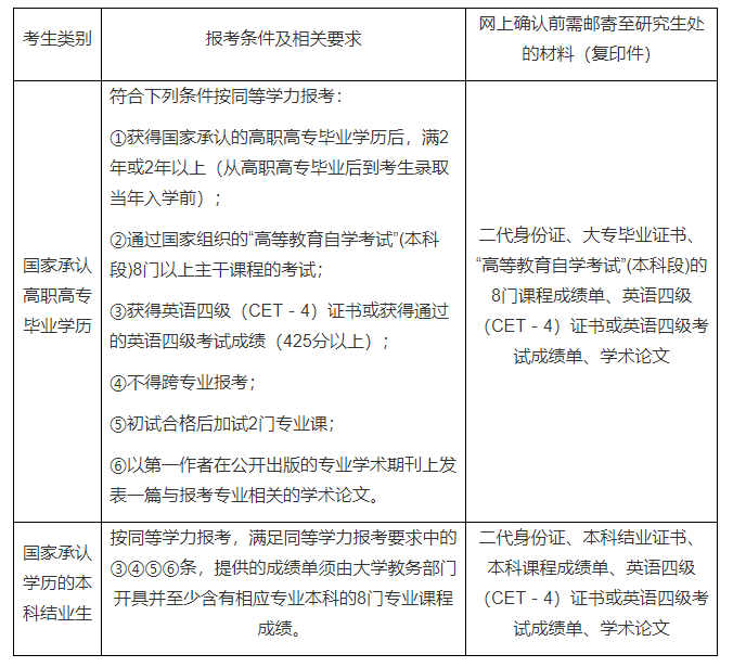 1.国家承认学历的应届本科毕业生(含普通高校、成人高校、普通高校举办的成人高等学历教育等应届本科毕业生)及自学考试和网络教育届时可毕业本科生,考生录取当年入学前必须取得国家承认的本科毕业证书或教育部留学服务中心出具的《国(境)外学历学位认证书》,否则录取资格无效。
