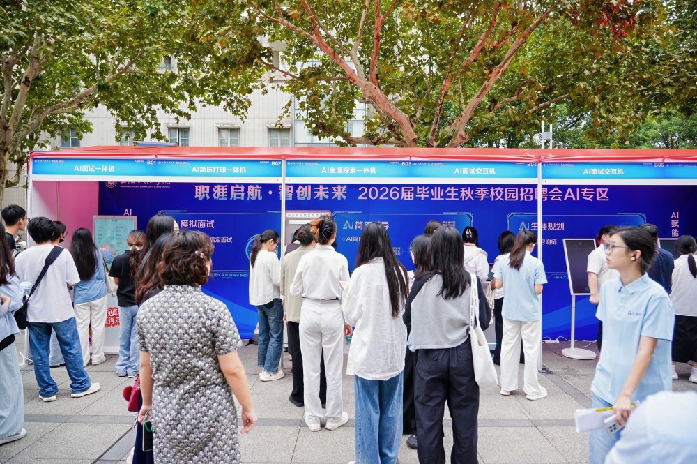 作为本次招聘会的亮点,“AI智慧专区”首次亮相即引发广泛关注。该专区由学校人工智能与生涯发展研究中心联合中国教育在线共同打造,包含AI模拟面试机、AI简历一体机、AI生涯探索机等AI就业智能设备,为现场求职学子提供模拟面试训练、AI简历修改及打印、个性化生涯规划建议等服务,助力学子提升求职应聘技巧。