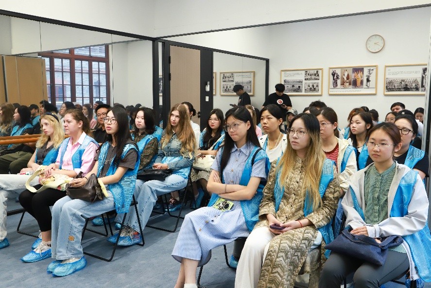 作为余派老生、国家一级演员及上海市非遗传承人,王珮瑜的演唱古朴隽永,扮相俊秀儒雅,唱念做表皆具大家风范。这堂课从瑜音社一楼的京剧小博物馆开始,精美绝伦的戏服行头、栩栩如生的道具与古朴的传统乐器静静陈列,仿佛一部立体的京剧史书。同学们不仅驻足观赏,更在讲解老师指导下亲手击响铙钹、敲响小锣。当清亮的锣声在展厅中回荡,传统艺术瞬间“活”了起来,化为一次真切可感的互动与对话,引发现场同学们的阵阵赞叹。这不只是参观,更是“预热”。当大家带着对京剧的好奇与期待步入主课堂时,主讲人王珮瑜老师已等候在此,一场关于京剧之美的深度解码正式开启。