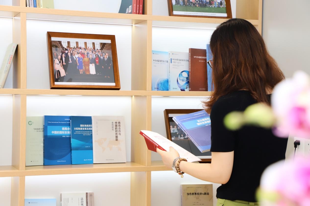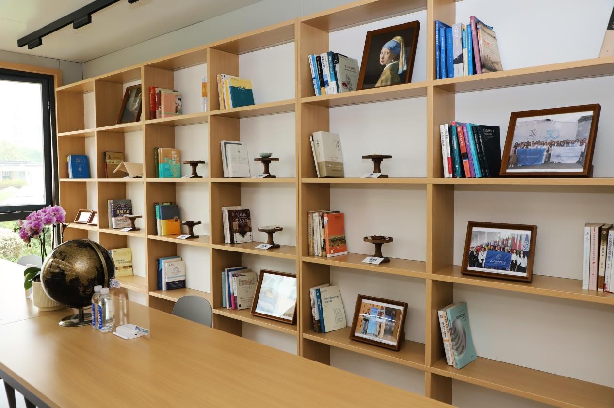 展厅的展架上陈列着瓷器、茶叶、珍珠、丝绸等与中国密切相关的全球性商品以及相关研究著作,帮助师生探索国际贸易背后的故事。在研习室的书架上,摆放着学校专家和老师关于全球经贸治理的专著和刊物,以及国际组织人才标准和职业发展相关指南,供师生取阅研读。