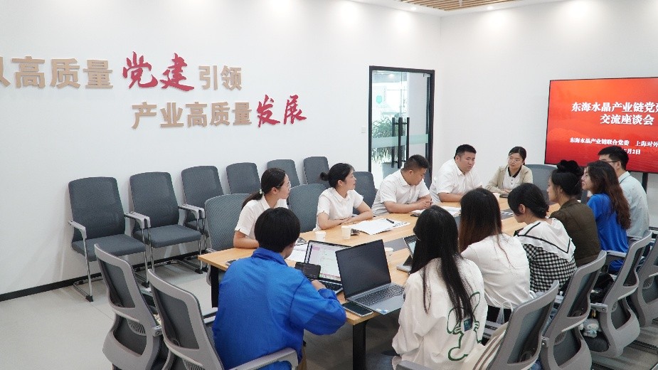 在东海水晶产业链党群综合服务中心,调研团队与相关工作人员面对面交流,深入了解如何将党的组织优势有效转化为产业发展优势。该中心以“七彩晶链”工作机制为抓手,整合物业服务、电商培训、知识产权保护等多项职能,为产业链上下游企业提供“一站式”服务平台。针对水晶产业链集聚性不强问题,努力构建水晶产业全链,加快推进水晶加工综合服务基地、水晶云城等项目建设。中心通过设立版权工作站、强化跨部门执法协作等举措,构建起品牌保护和市场秩序维护的长效机制。工作人员还向调研团队介绍了当地在人才引进方面的措施一一由联合党委牵头对接高校资源,制定人才本地化发展政策,优化子女教育等配套服务,为“水晶”和“穿戴甲”产业的提质升级提供坚实的组织保障。座谈后,团队参观了党群综合服务中心,进一步了解党建在引领产业规范发展中的关键作用。
