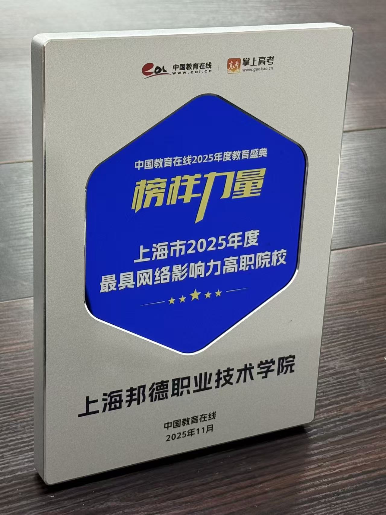 近日,中国教育在线“榜样力量·2025年度教育盛典”优秀案例名单公布。上海邦德职业技术学院凭借极具创新性与前瞻性的招生宣传策略,以及扎实过硬的宣传执行实力,从众多高校中突围,获评“上海市2025年度最具网络影响力高职院校”。