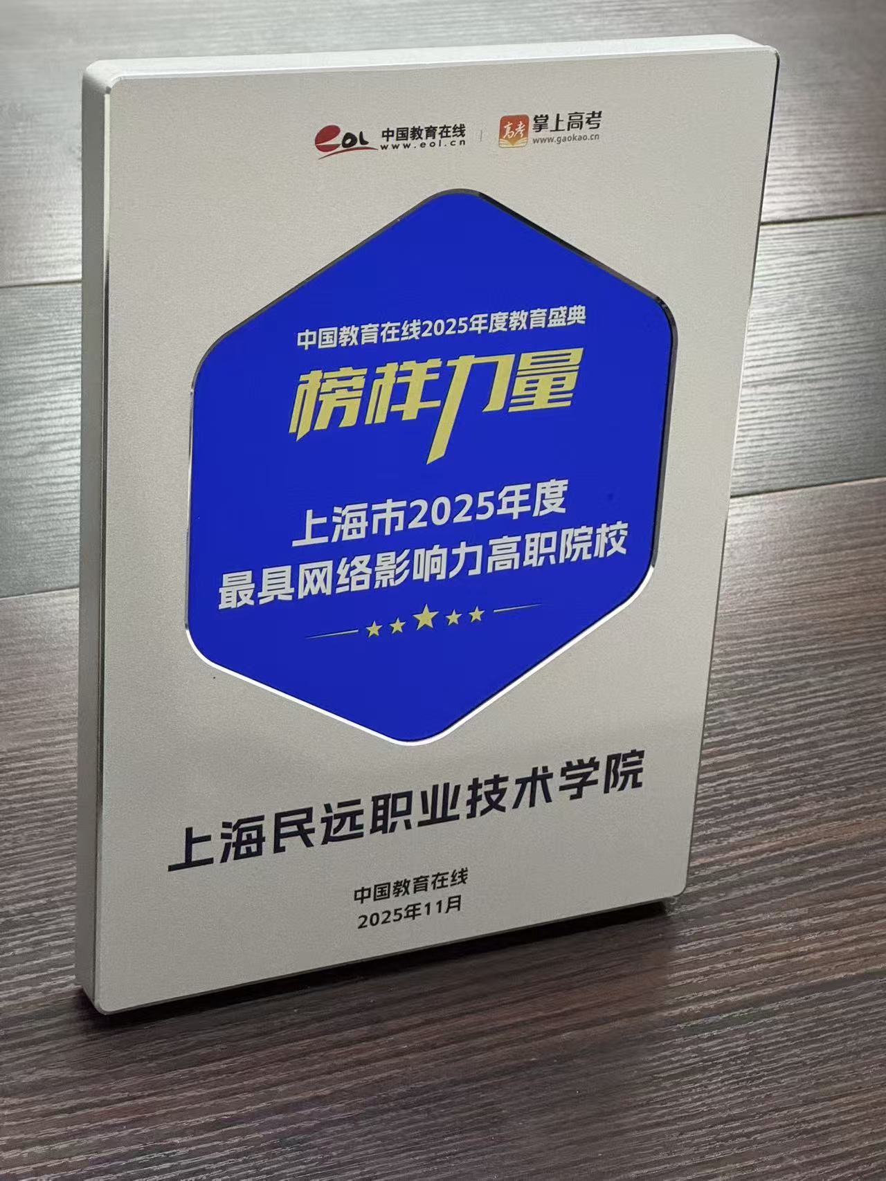 近日,中国教育在线“榜样力量·2025年度教育盛典”优秀案例名单公布。上海民远职业技术学院凭借极具创新性与前瞻性的招生宣传策略,以及扎实过硬的宣传执行实力,从众多高校中突围,获评“上海市2025年度最具网络影响力高职院校”。