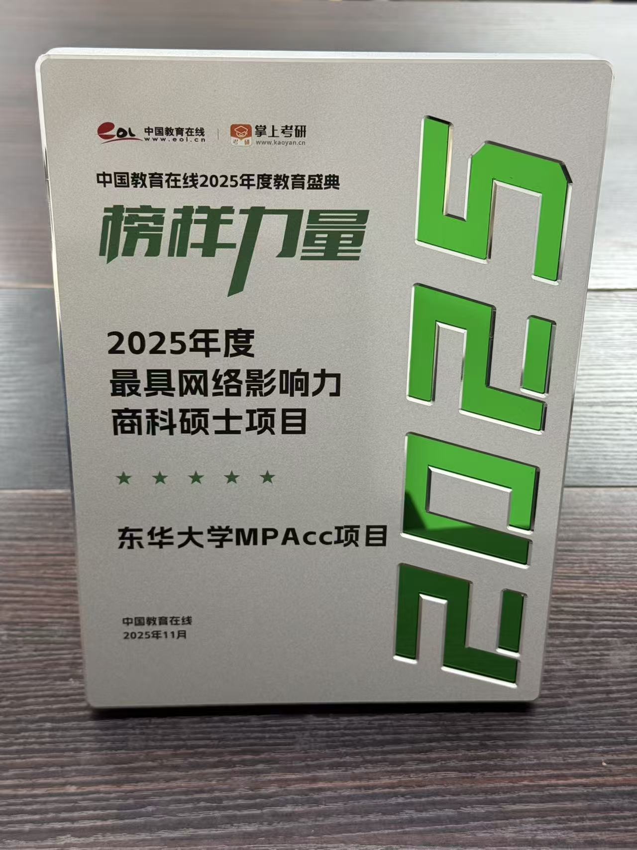 近日,中国教育在线“榜样力量·2025年度教育盛典”优秀案例名单公布。东华大学MPAcc项目凭借极具创新性与前瞻性的招生宣传策略,以及扎实的宣传执行实力,获评“2025年度最具网络影响力商科硕士项目”。