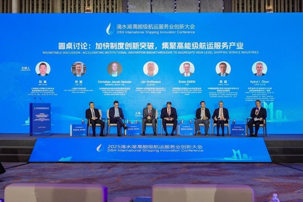 在随后的圆桌讨论环节,嘉宾们围绕两大议题展开深度交流,凝聚行业共识。上海航交所副总裁刘越、全球海事论坛对外合作与社群关系总监克里斯蒂安・雅各布・汉森(Christian Jacob Hansen)、世界银行海事运输与港口全球负责人扬・霍夫曼(Jan Hoffmann)、法国船级社北亚区 QHSE 及运营总监艾睿(Ersin EREN)、世界海事大学海事研究主任兼海事能源管理负责人艾库特・奥尔瑟(Aykut I. Ölçer)等嘉宾,围绕“加快制度创新突破,集聚高能级航运服务产业”深入研讨,分享前沿实践与思考。