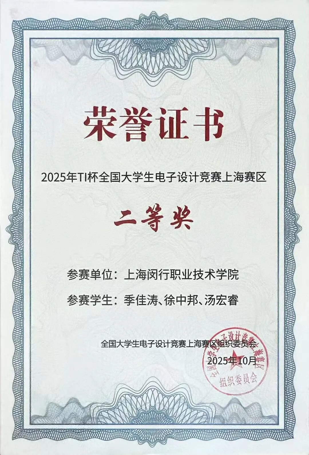 近日,2025年全国大学生电子设计竞赛(TI杯)上海赛区获奖名单正式揭晓。由我院智能制造系学生徐中邦、季佳涛、汤宏睿组成的参赛团队首次出征,凭借出色的创新设计与扎实的专业能力,在激烈竞争中脱颖而出,荣获赛区二等奖。指导教师万雯荣获“优秀指导教师”称号,实现了闵职院在该项高水平赛事中的突破。