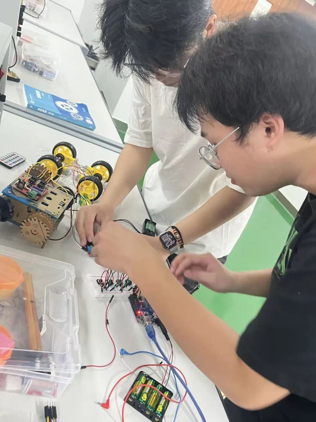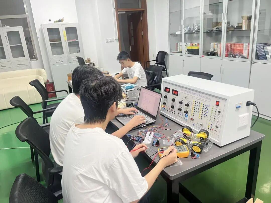 精工出巧器,笃行见真章。为备战此次竞赛,徐中邦、季佳涛、汤宏睿三位同学主动放弃暑假休息,整个七月在指导老师的带领下,坚守智能制造系实验室,在元器件与代码之间反复打磨、不断优化。他们的作品--“一种以Arduino-Mega2560单片机为控制器的非接触式控制盘设计”,融合了漫反射式光电传感器、L298N电机驱动电路、超声波传感器及直流风扇等模块,构建了一套集成闭环控制、信号交互与自适应调节的嵌入式系统。三位同学充分发挥各自专长,形成“程序编写+实物制作+技术文档”三位一体的高效协作模式,最终高质量完成作品,赢得评委一致好评。