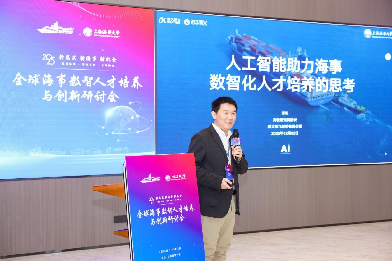 科大讯飞股份有限公司高教研究院院长李礼在题为“人工智能助力海事数智化人才培养的思考”报告中,提出“顶天立地、自主可控、通专结合、端云联动、软硬一体”五大发展方向,并介绍了实现数实共生、伴云出海的实践路径。