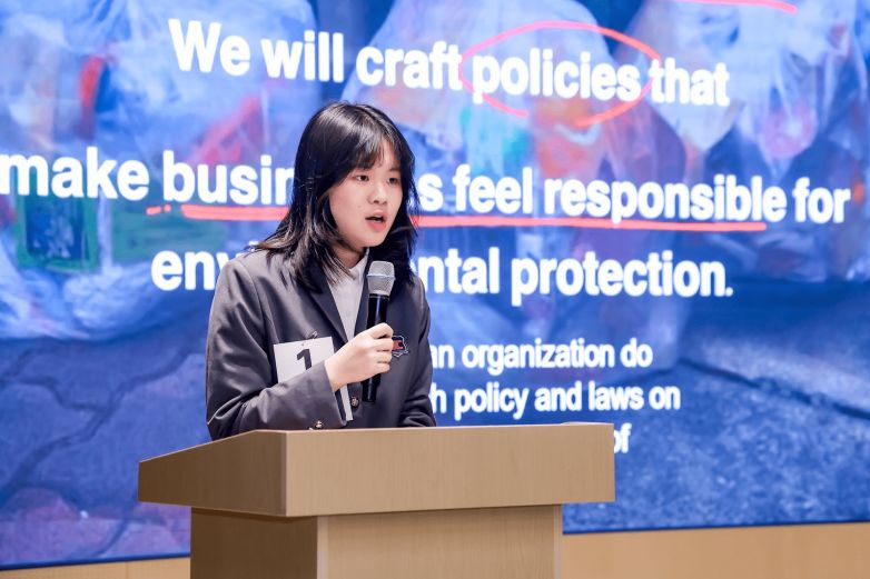随着议程从宏观认知转向实践探索,“青年绿色方案竞标会”则转向具体行动。学生们聚焦“塑料污染”这一全球共同痛点,展开跨国协作与限时讨论。意大利代表提出技术合作构想,德国代表解析押金返还系统的运行逻辑,中国代表分享可降解替代技术与全民减塑经验,推动“减塑”从理念落地为各国可操作的本土方案,并建议推动校企合作研发低成本环保餐具,让青年成为减塑议题的行动者与创新者。答辩环节中,面对“责任主体是谁”“如何追踪成效”等尖锐提问,学生代表们逻辑清晰、沉着应对,锤炼了批判思维与沟通能力。最终,一份凝聚了多方智慧的《青年绿色行动提案》获得通过,并由各国“代表”郑重签署。