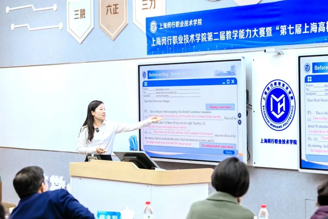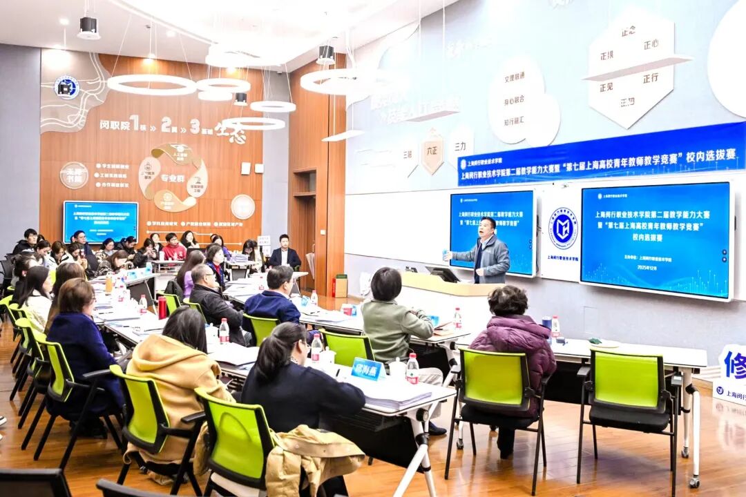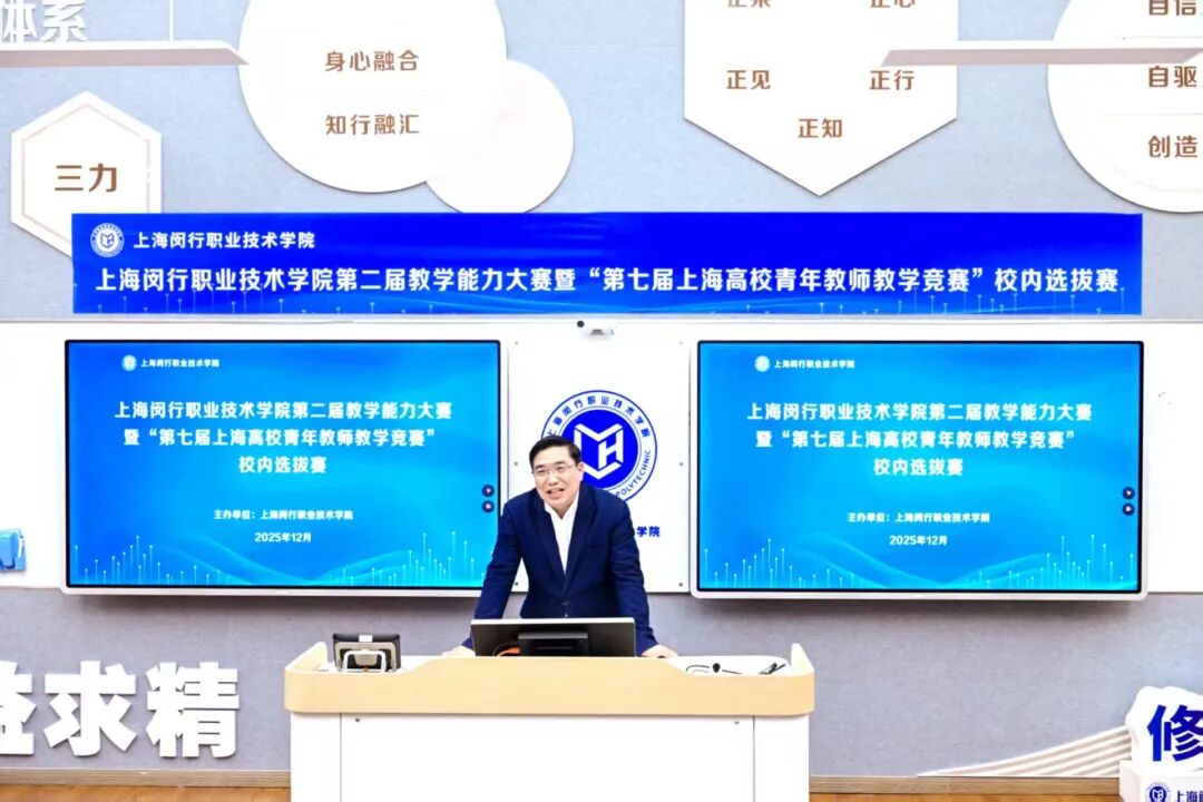 岁末冬深,薪火相传。在深入学习贯彻习近平新时代中国特色社会主义思想和党的二十大精神的重要节点,为落实立德树人根本任务,响应市教卫工作党委、市教委、市总工会关于加强高校青年教师队伍建设的号召,2025年12月24日,上海闵行职业技术学院第二届教学能力大赛暨“第七届上海高校青年教师教学竞赛”校内选拔赛在精益楼102教室成功举办。14位参赛教师同台竞技展风采,6位教育专家与院领导、系部主任组成的评审团精准点评传经验,40岁以下青年教师现场观摩汲取养分,共同完成了一场聚焦教学质量、赋能教师成长的“育人接力赛”。