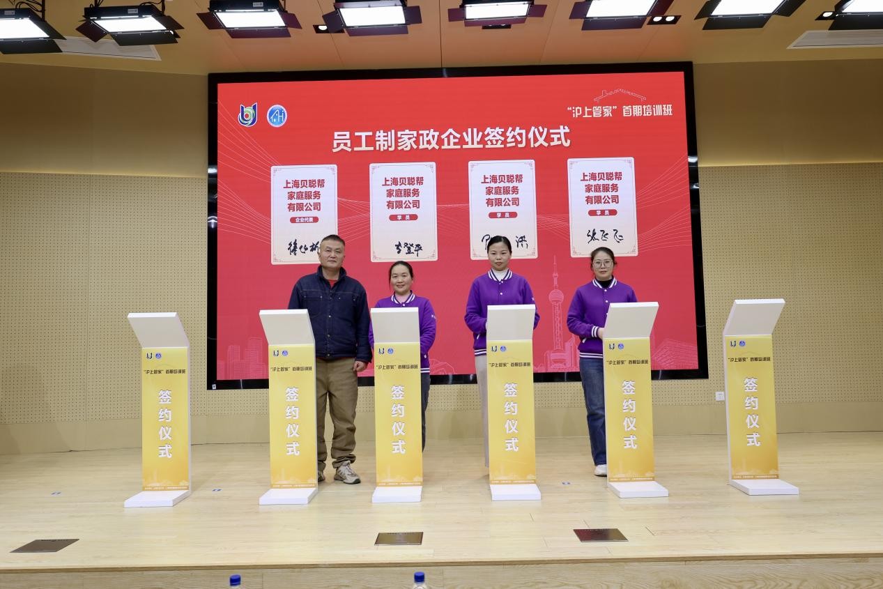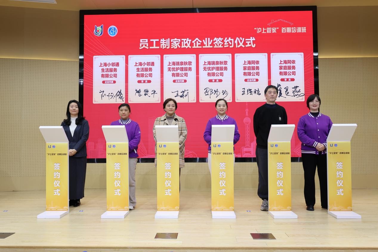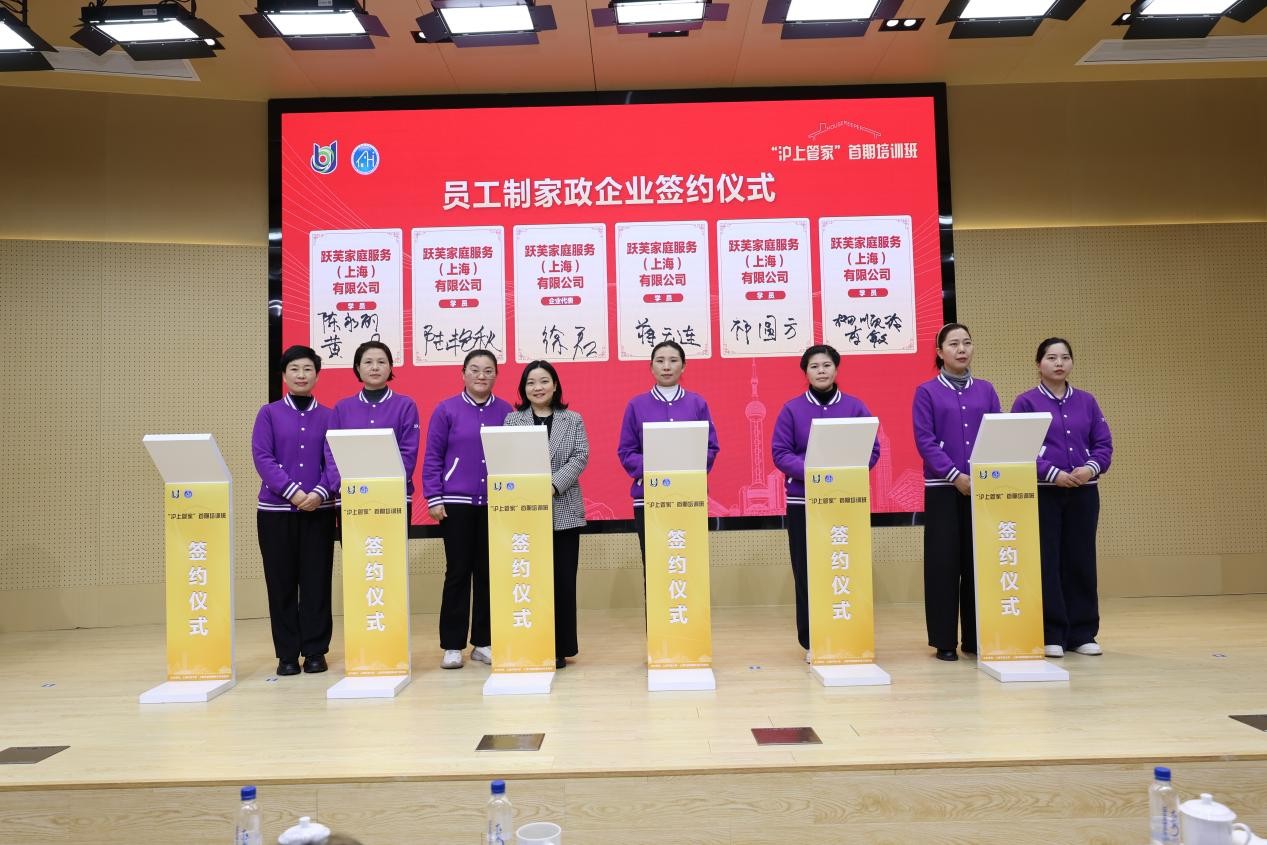 仪式上,“员工制签约环节”掀起高潮。5家知名家政企业积极响应上海推动员工制家政企业发展的政策导向,现场与13名培训学员签订员工制协议。这既是对学员专业能力的高度认可,也体现了行业向规范化、职业化发展的切实行动,有助于家政企业增强队伍稳定性,实现规模化发展,做强做优服务品牌。