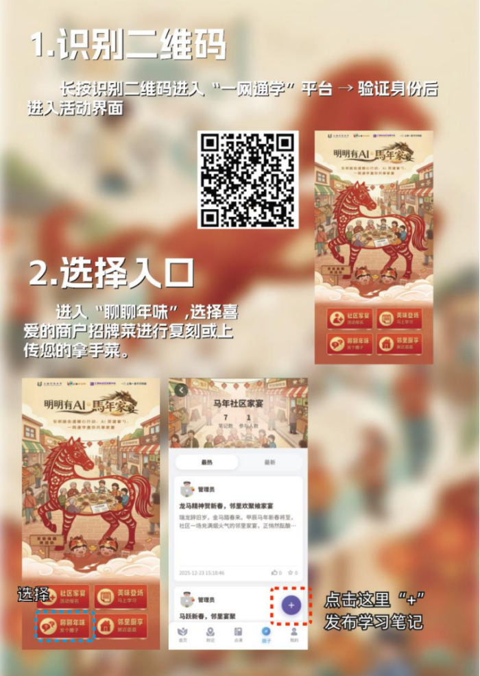 通过长按识别二维码登录“一网通学”平台,进入“聊年味”专区,将自家拿手菜以图文形式上传至“一网通学”平台“学习圈”,发布学习笔记。平台将开放点赞通道,点赞量前5名的居民将获邀亲临线下马年家宴,与邻里共赴团圆;点赞量前10名的居民可领取保温杯、米桶、保鲜盒等实用礼品(随机发放,以现场实物为准)。通过“社区共创”模式,每位居民都能成为社区学习的参与者、传播者。