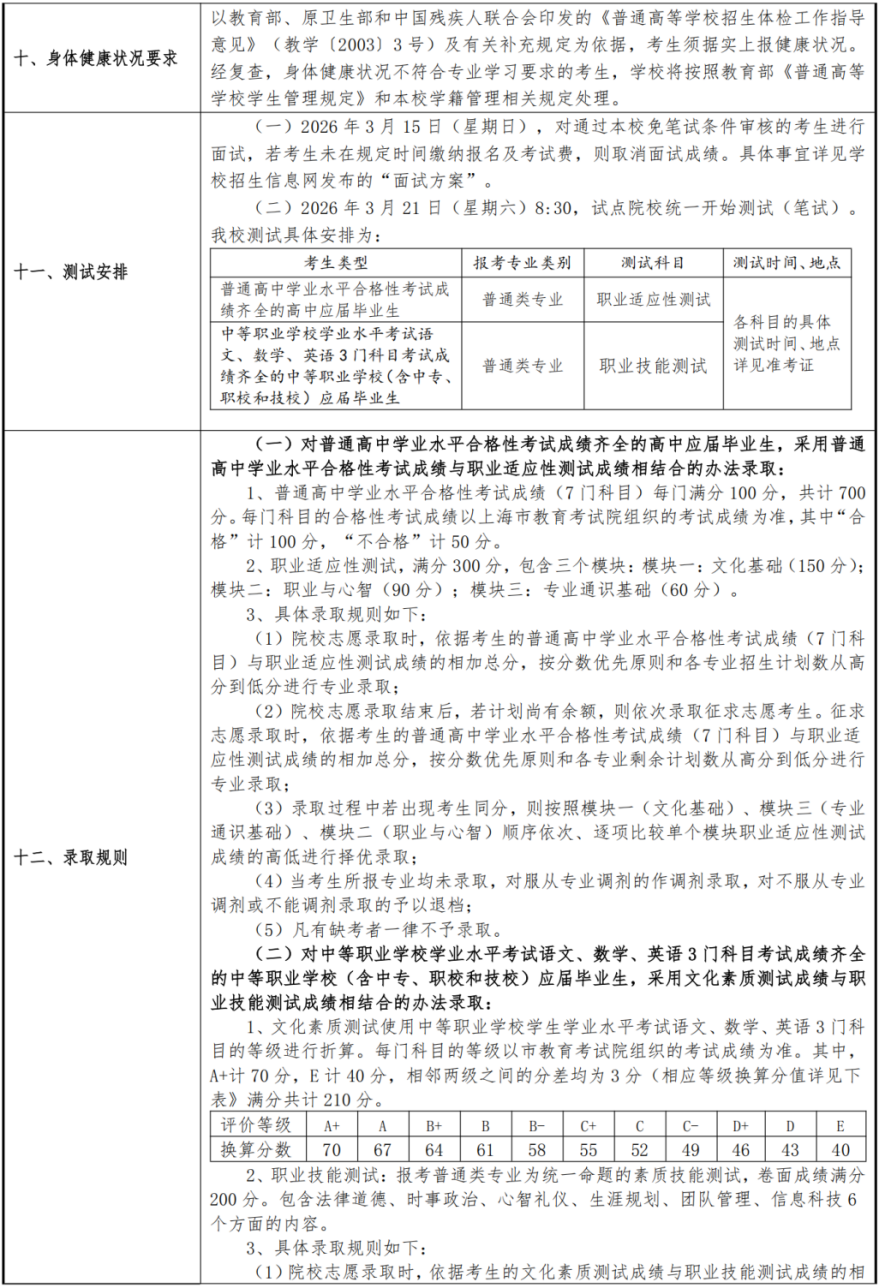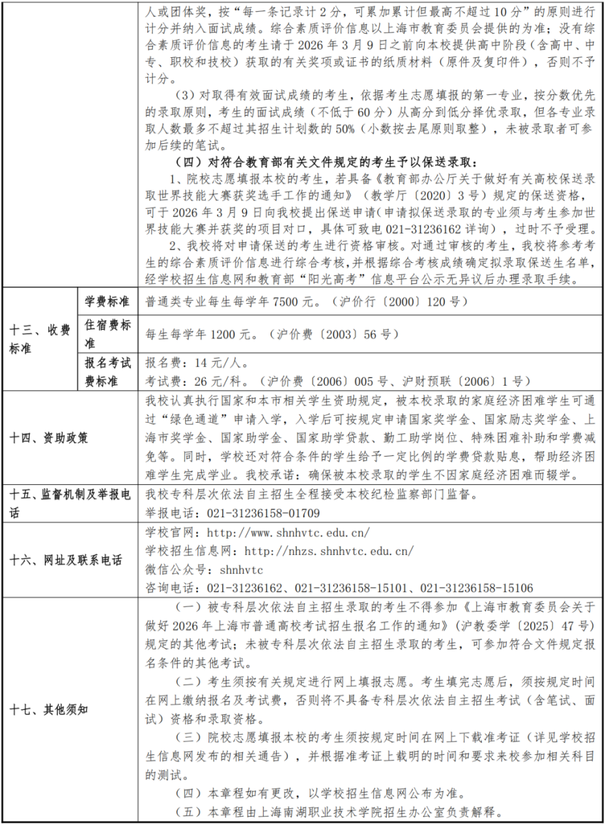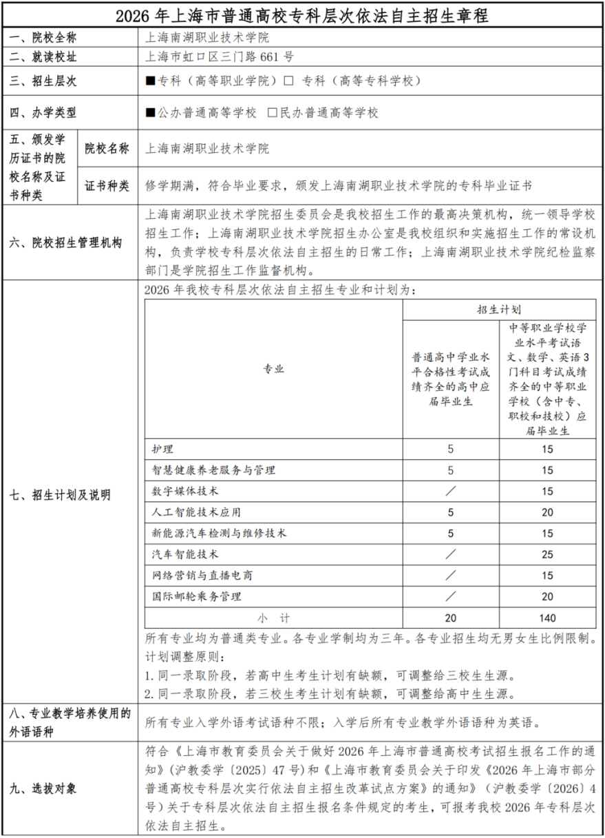 上海南湖职业技术学院2026年专科层次依法自主招生章程