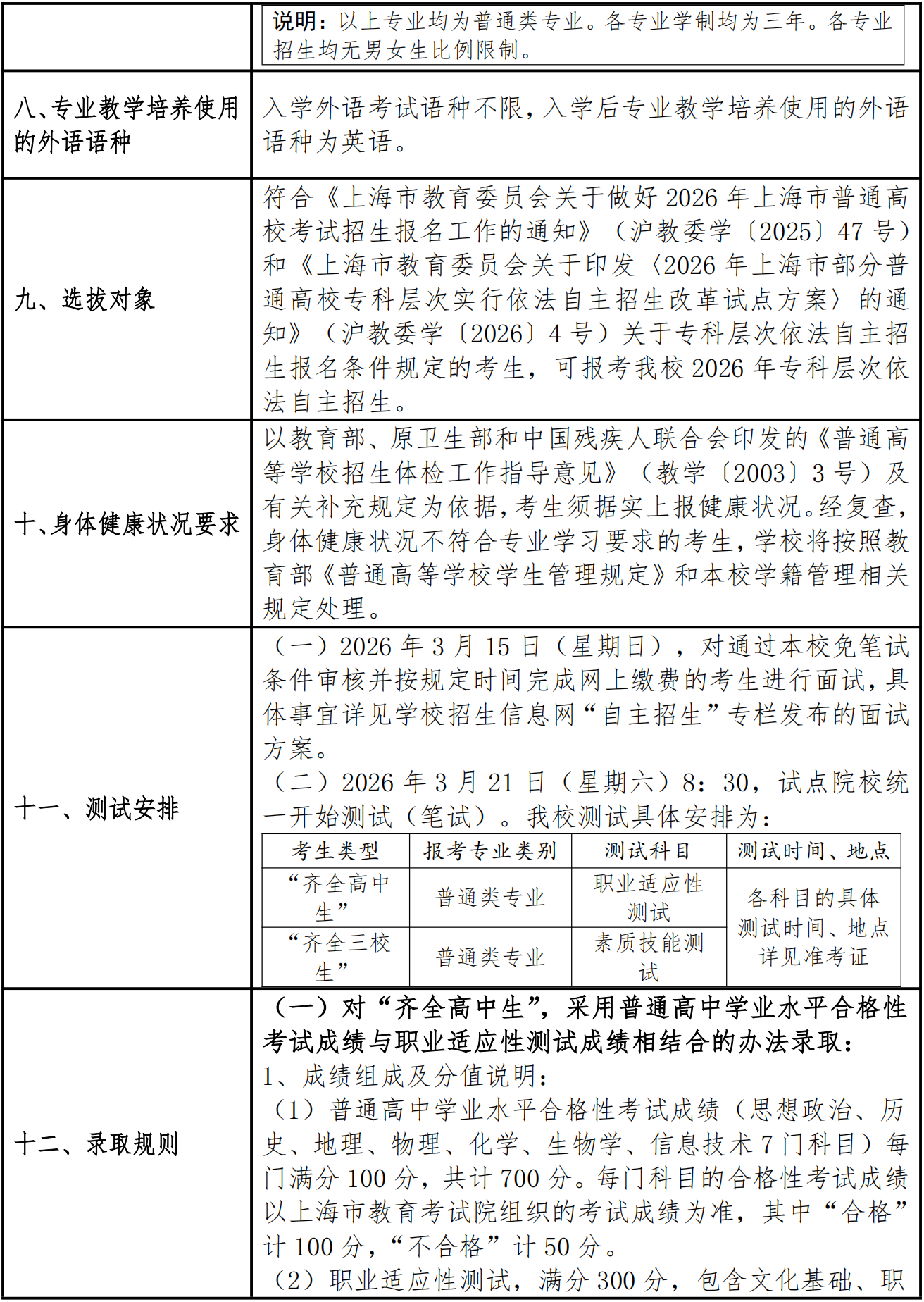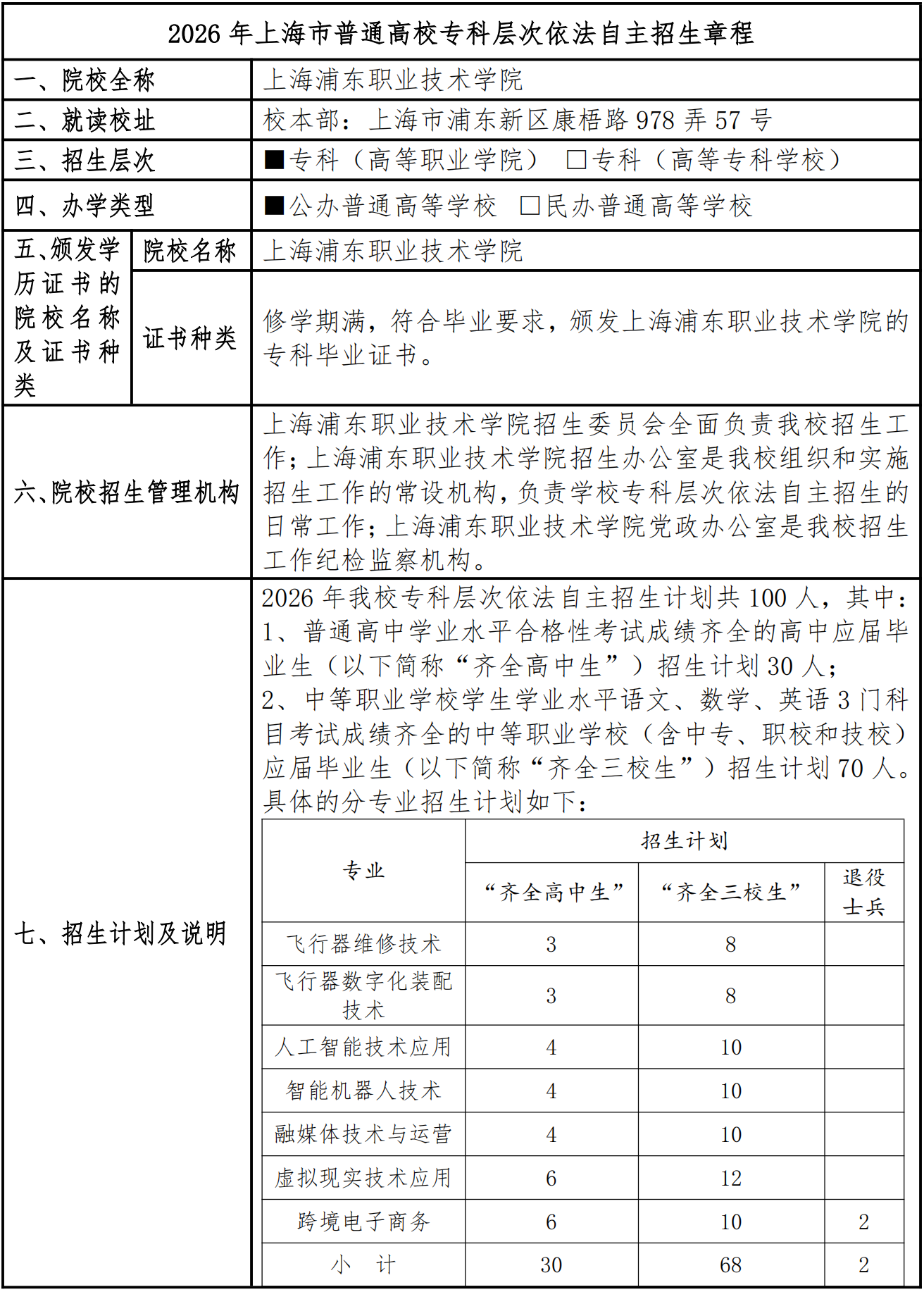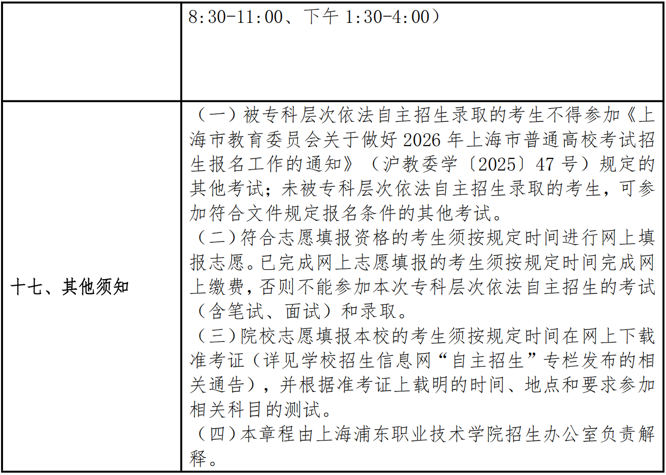 上海浦东职业技术学院2026年专科层次依法自主招生章程