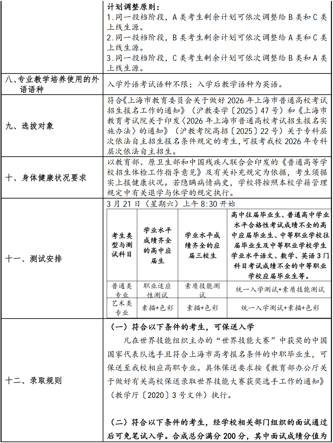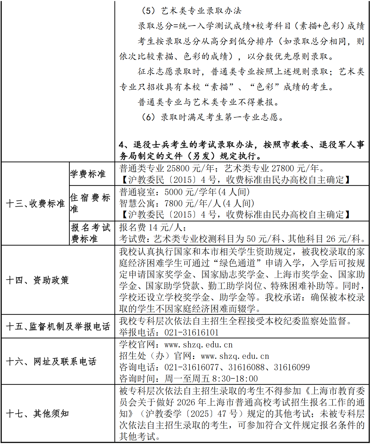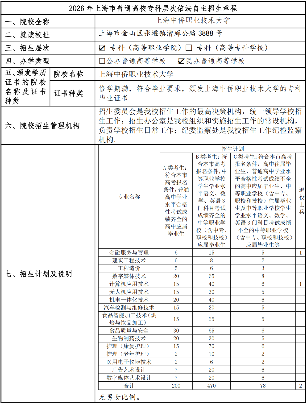 上海中侨职业技术大学2026年专科层次依法自主招生章程