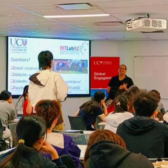 同学们走进新西兰国家级人机交互实验室HIT Lab NZ,亲身体验哈利波特式飞天扫帚骑行、Nova360球形模拟、全动座舱机甲对战等前沿体验,沉浸式感受科技的魅力;“可持续未来科学”课程更是打破教室边界,从课堂理论学习延伸至Red Zone与New Brighton Beach的户外实践,在海风与阳光中探讨生态与发展的平衡。AI艺术体验课上,同学们解锁创意新可能,而与UC学生导师共同推进的项目实践,从构思到落地的全流程锻炼,让学术能力与协作精神双双提升。