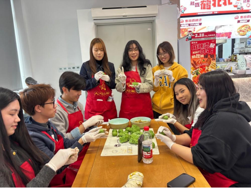 在随后的文化体验环节,食堂师傅亲自示范青团的完整制作过程,从揉制青团皮到包馅塑形,详细拆解每个步骤的操作要领,并强调揉面力度、包馅技巧等关键细节,引得现场学子目不转睛、跃跃欲试。中外学生纷纷穿上围裙,中国学生主动担任“文化小使者”,手把手指导留学生制作青团,同时细致讲解青团“迎接春天”的寓意。活动中大家专注投入,现场充满欢声笑语,不同国籍的学子因美食与文化亲密交流,春日的美好与跨文化的温暖和谐相融。
