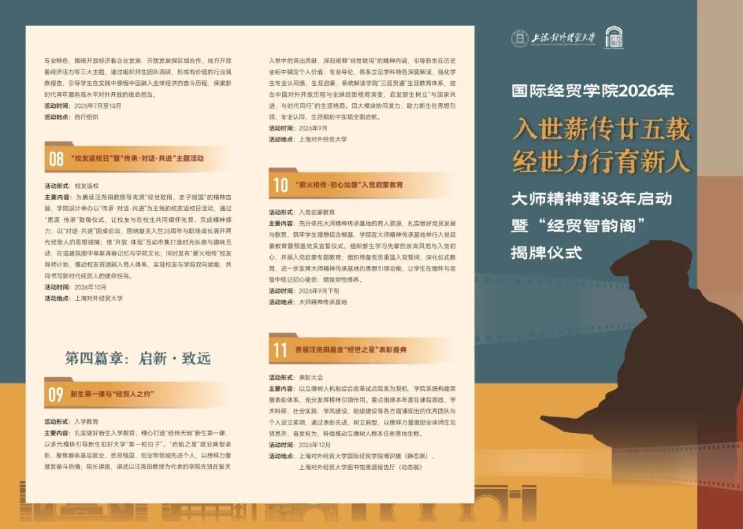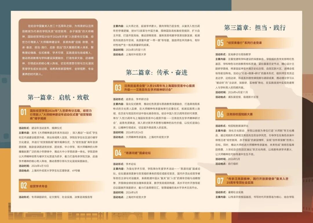 国际经贸学院将2026年全年贯穿为传承大师精神的深耕之年。从课堂到社区,从理论研讨到自贸区一线的实践丈量,学院正着力打通“从课堂到社会”的“最后一公里”。