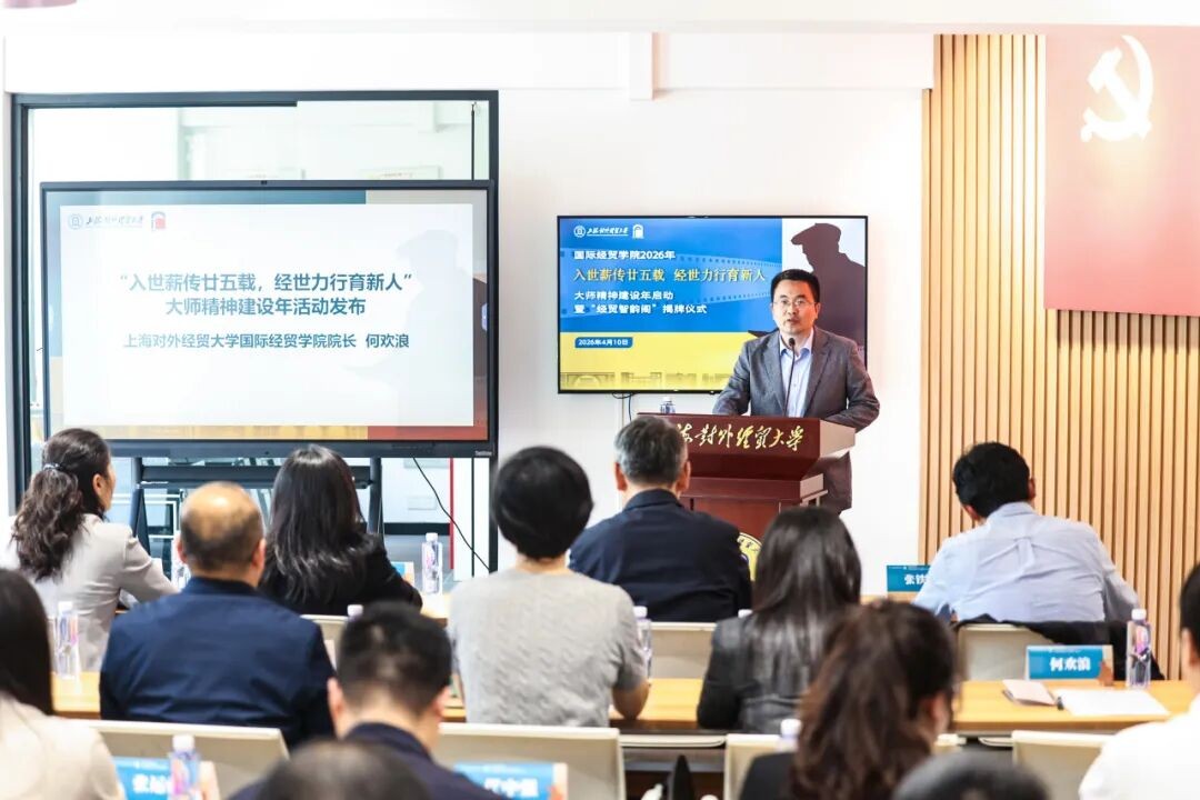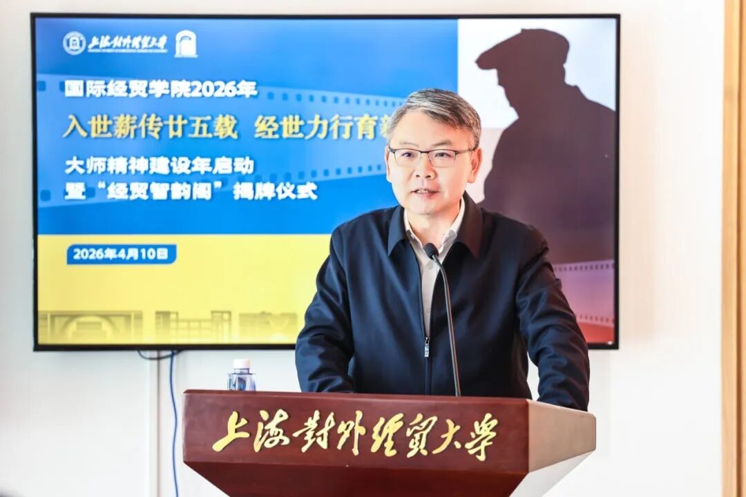 4月10日下午,上海对外经贸大学国际经贸学院在松江校区学生社区理享家、49号楼举行2026年“入世薪传廿五载,经世力行育新人”大师精神建设年启动暨“经贸智韵阁”揭牌仪式。校党委书记祁明出席活动并致辞。学校办公室主任赵静,校党委教师工作部部长、人事处处长张铁铸,校党委学(研)工部部长、学生处处长缪韵笛,党委组织部副部长张晴晴,党委宣传部副部长张帅,校党委学(研)工部副部长、团委书记司徒力云,国际经贸学院党委书记张嵘,国际经贸学院院长何欢浪,国际经贸学院副院长代中强以及学院师生代表出席活动。活动由国际经贸学院党委副书记董雪主持,师生代表齐聚一堂,共同开启以大师精神引领立德树人的新篇章。