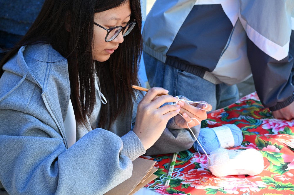 非遗集市在樱花大道火热展开。南湖摊位前,粽子与非遗尺糕香气四溢,菱画技艺传承人指导师生提笔勾勒,文旅宣传材料被争相领取;泉州摊位旁,芋泥饼地道可口,簪花围体验区排起长队,安溪茶道尽显闽南匠心。各省学生摊位依次排开,来自天南海北的美食、民俗、手工艺琳琅满目——从内蒙古的奶制品到广西的螺狮粉,从云南的云腿月饼到东三省的锅包肉,师生穿行其间,边尝边聊,笑语不断。