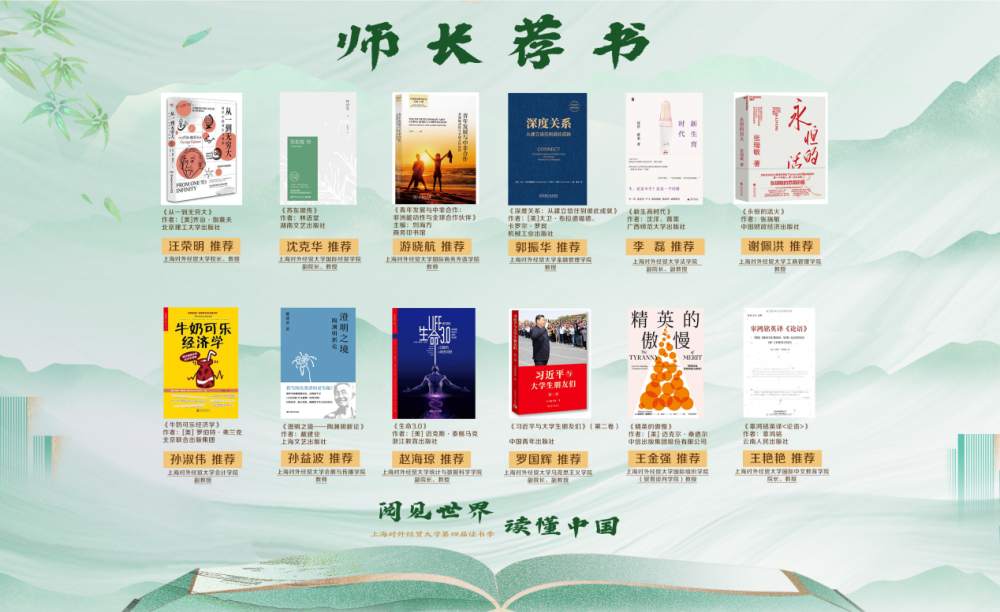 各学院师长也纷纷响应,带来《苏东坡传》《澄明之境——陶渊明新论》《辜鸿铭英译<论语>》《精英的傲慢》等图书。12本推荐书目涵盖人文、历史、传记、时政热点等,立足立德树人根本任务,融汇思想引领与学术启迪,引导上经贸大学子在字里行间阅见世界、读懂中国。