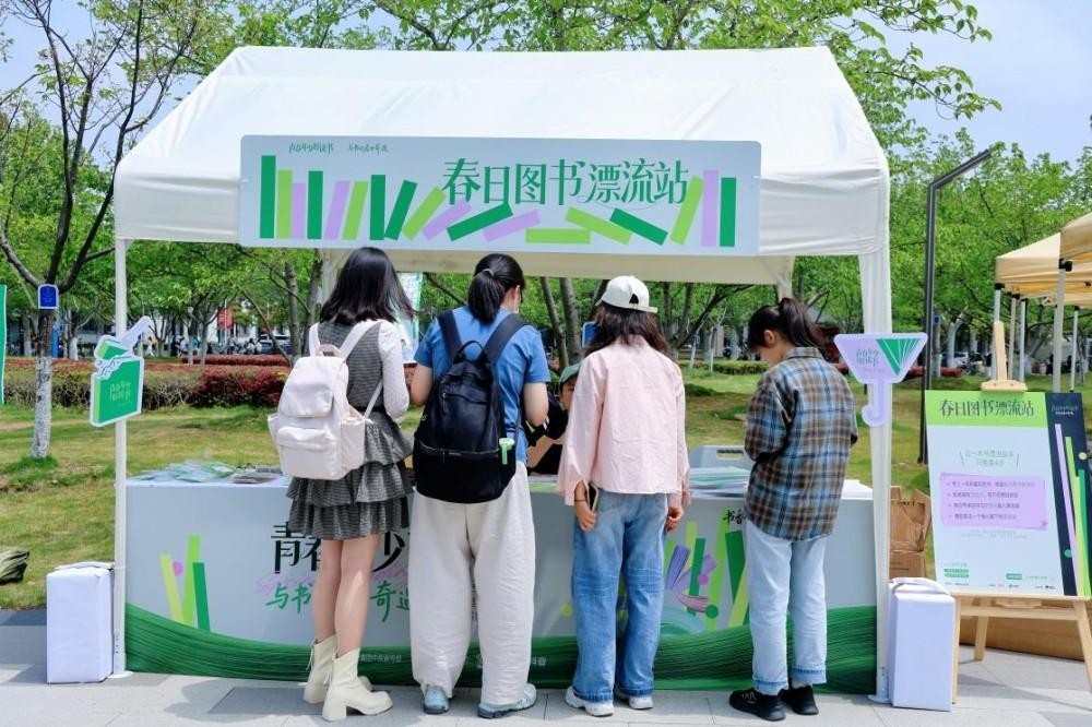 一本喜爱的书、一张填好抖音ID的漂流卡,同学们写好阅读感悟与寄语一并放进漂流袋中,等待下一个经过摊位的学生将其打开。摊位前人潮涌动,大家热情高涨,书籍传递流转,同学们在春日校园里迎来一场以书为媒的温暖邂逅。