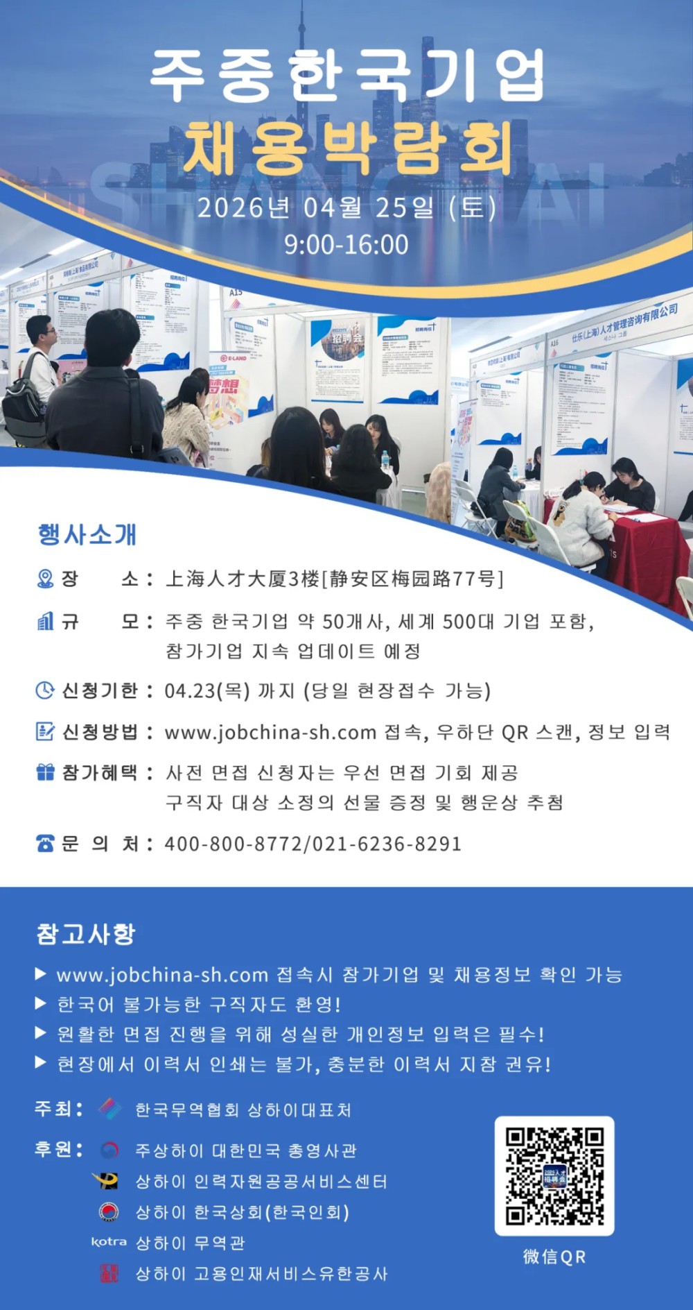 2026年求职季重磅来袭,由韩国贸易协会上海代表处主办的“2026在华韩资企业人才招聘会”,于4月25日(周六)开展,欢迎各位求职者踊跃报名参与!