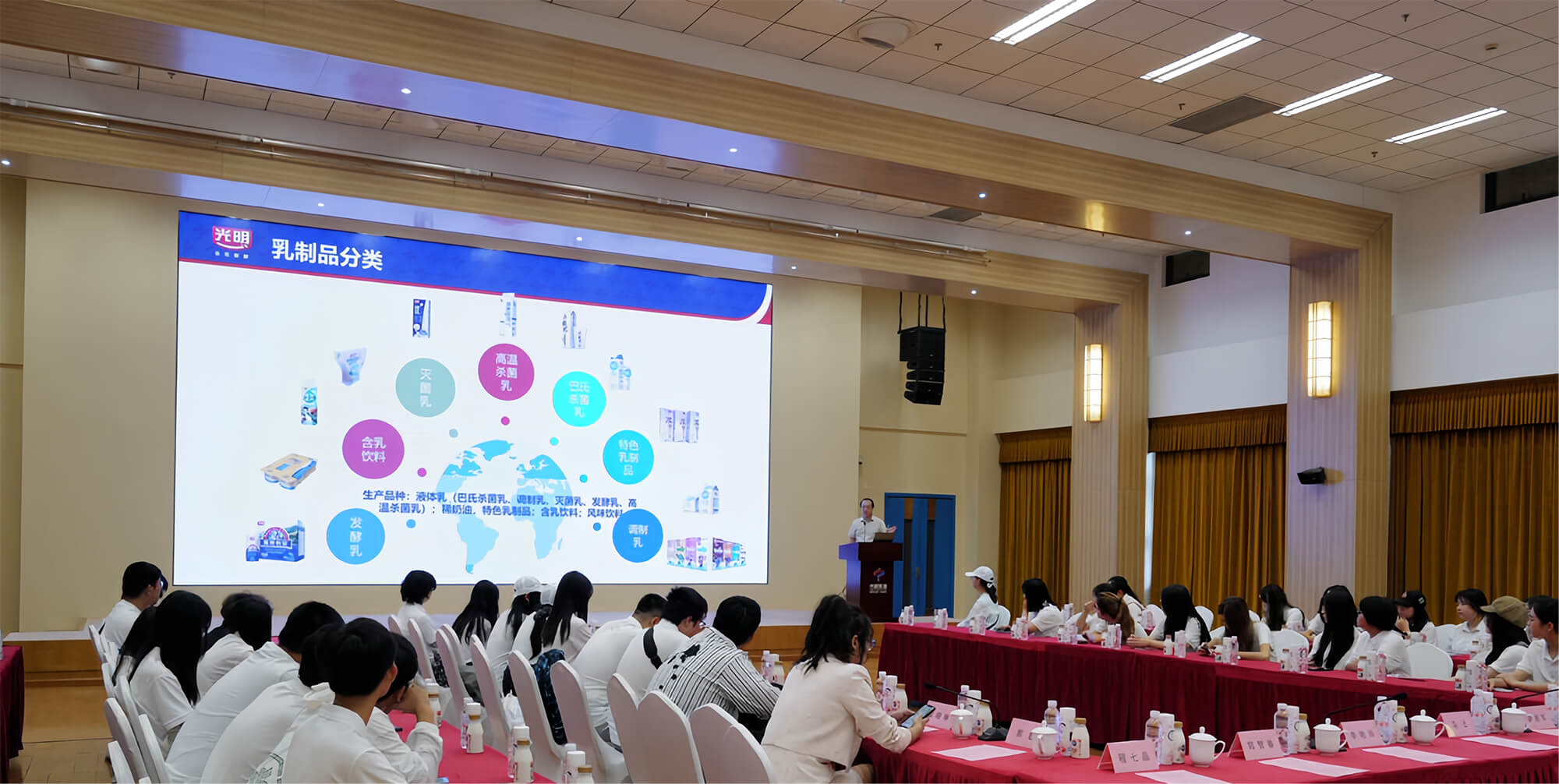 谈及光明品质,丁老师语气自豪且坚定:“我们坚持以质量为核心、以创新为动力、以品质促品牌,致力于世界级制造品质,这既是对产品质量的坚守,更是对消费者健康的承诺。”此外,他还介绍了企业社会责任与人才需求,点明校企合作的重要价值。最后,丁老师以“因为光明,所以温暖”作总结,既彰显了企业对品质的执着,也传递出浓厚的人文关怀。