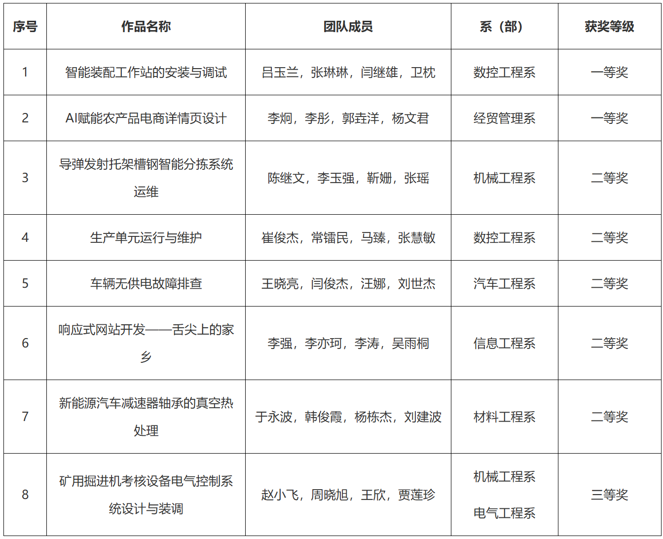 近日,由山西省教育厅主办的第十九届职业院校技能大赛教学能力比赛决赛落下帷幕。经过激烈的网络初审和现场决赛环节,山西机电职业技术学院参赛教师团队凭借扎实的专业功底和出色的现场表现,最终荣获一等奖2项、二等奖5项、三等奖1项,总体成绩位列全省前茅,实现了所有专业系获奖全覆盖,充分彰显了山西机电职业技术学院教师卓越的教学创新水平和高效的团队协作精神。
